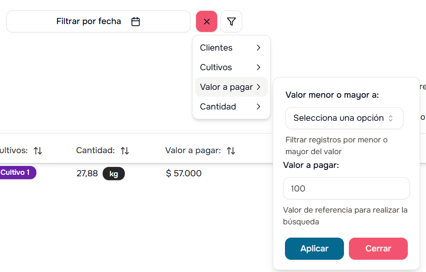 Por Valor a Pagar: Filtra por valor igual, menor o mayor a un monto