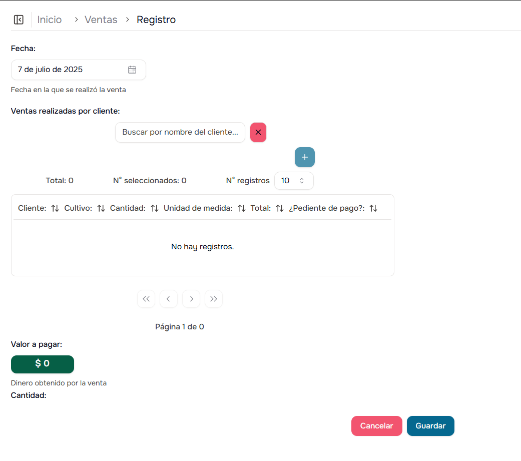 El módulo de Ventas te permite registrar y gestionar todas las ventas de tus productos agrícolas. Aquí podrás documentar las transacciones comerciales, asignar clientes, controlar el inventario y hacer seguimiento de los pagos pendientes.