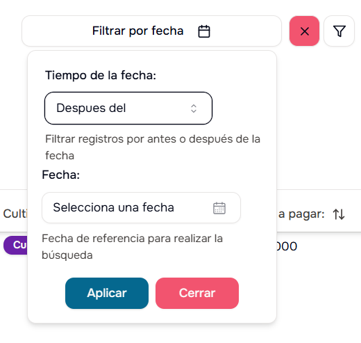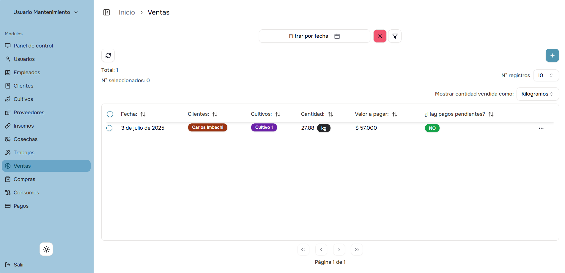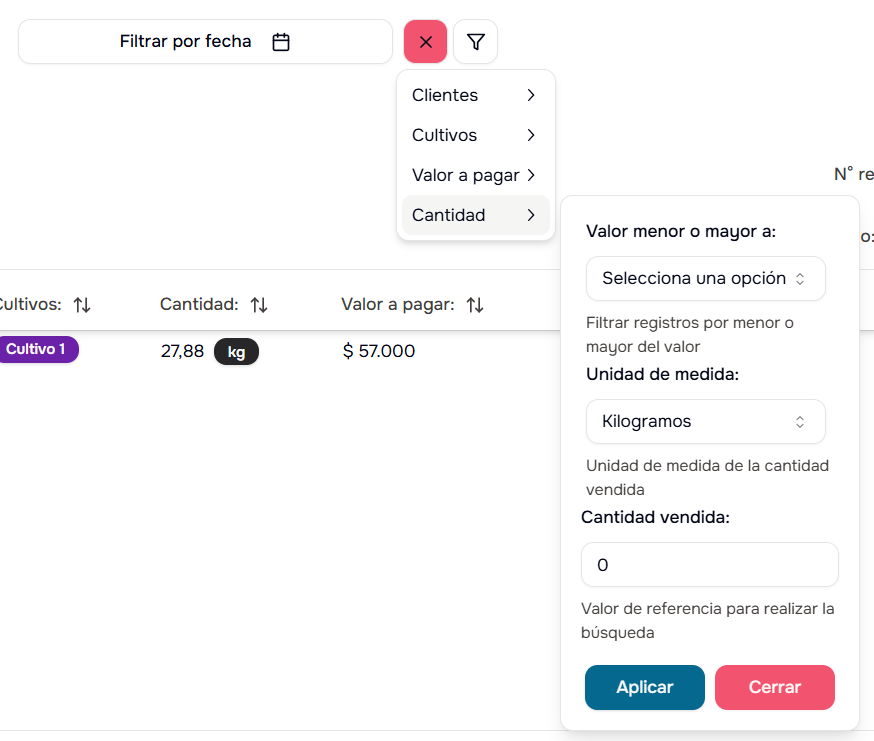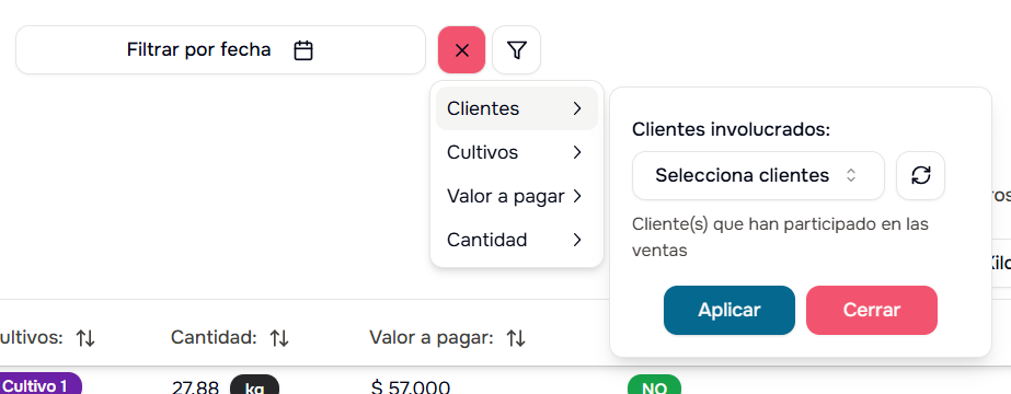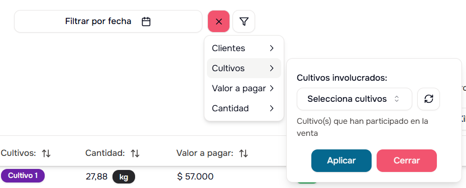 - Por Cultivo: Filtra ventas de un cultivo específico