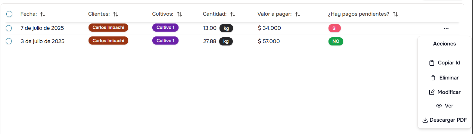 - Revisa los clientes, cultivos y cantidades