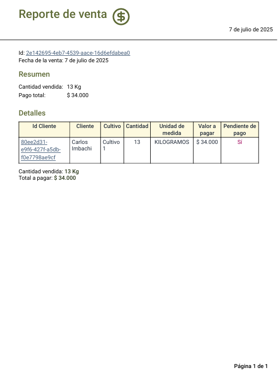 - Incluye toda la información: clientes, cultivos, cantidades, pagos