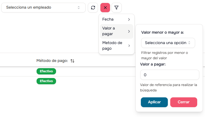 - Valor a Pagar: Filtra por monto (menor a, igual a, mayor a)