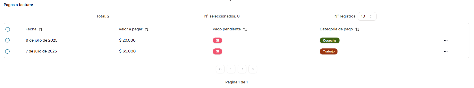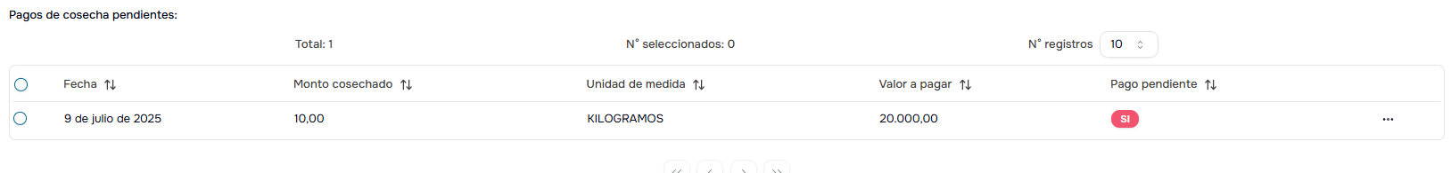 - Valor a Pagar: Monto pendiente por esa cosecha