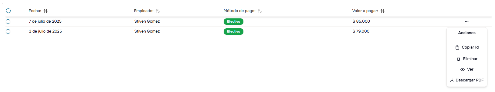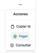 Para cada pago en la tabla, encontrarás un menú de acciones (tres puntos ⋮) con las siguientes opciones: