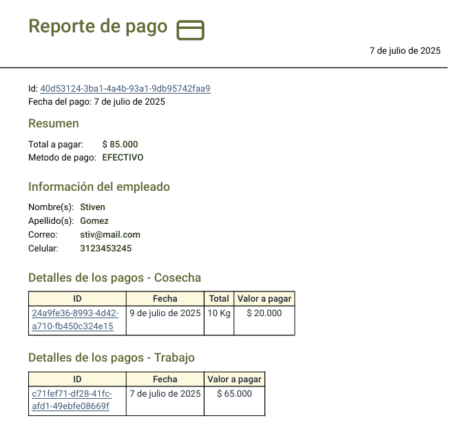 - Detalle de Cosechas Pagadas: Lista de cosechas con fechas y valores