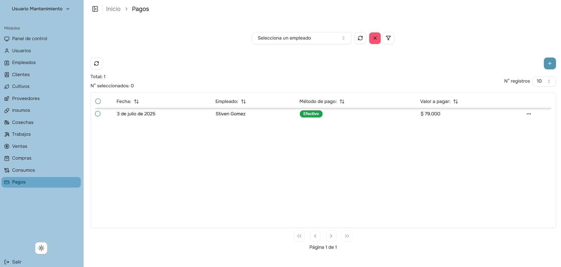El módulo de pagos te permite administrar eficientemente todos los pagos realizados a empleados por sus trabajos en cosechas y actividades laborales, manteniendo un control completo sobre las obligaciones financieras y el estado de los pagos.