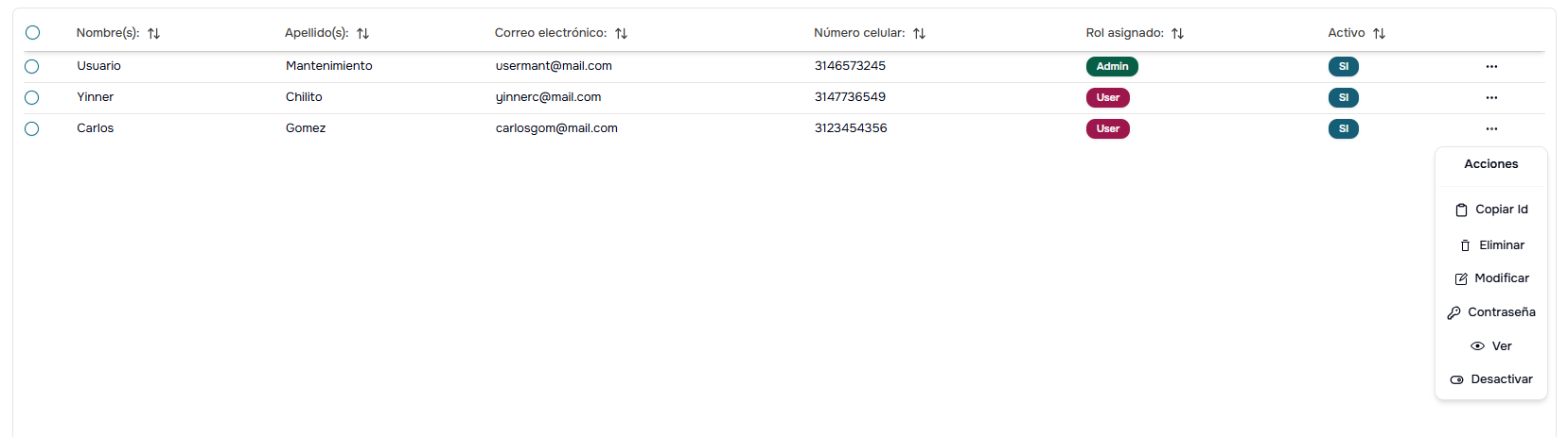 Cada usuario tiene un menú de acciones (tres puntos ⋮) con las siguientes opciones: