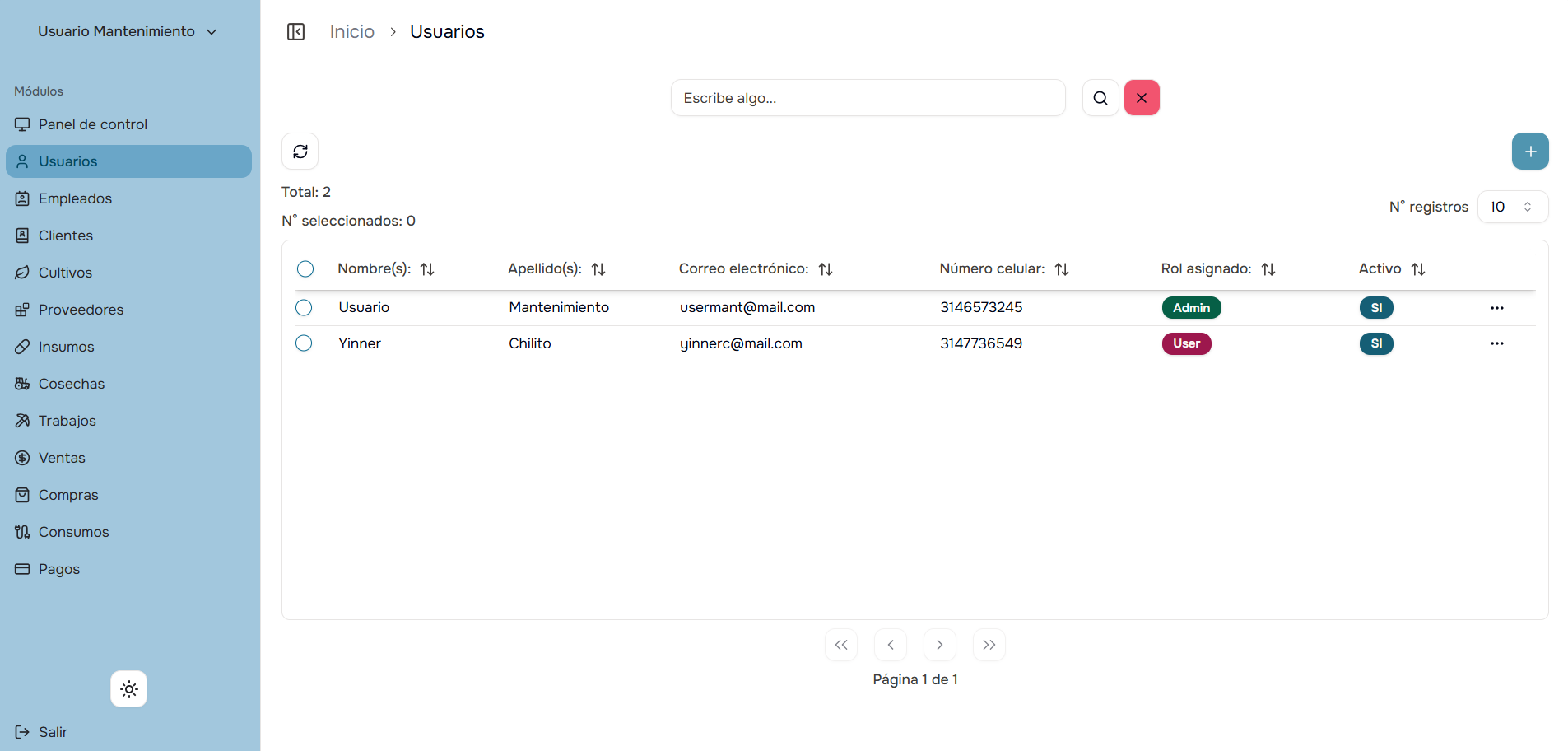 El módulo de Usuarios te permite administrar todos los usuarios que tienen acceso al sistema CropCo. Aquí podrás crear, modificar, eliminar y gestionar los permisos de cada usuario.