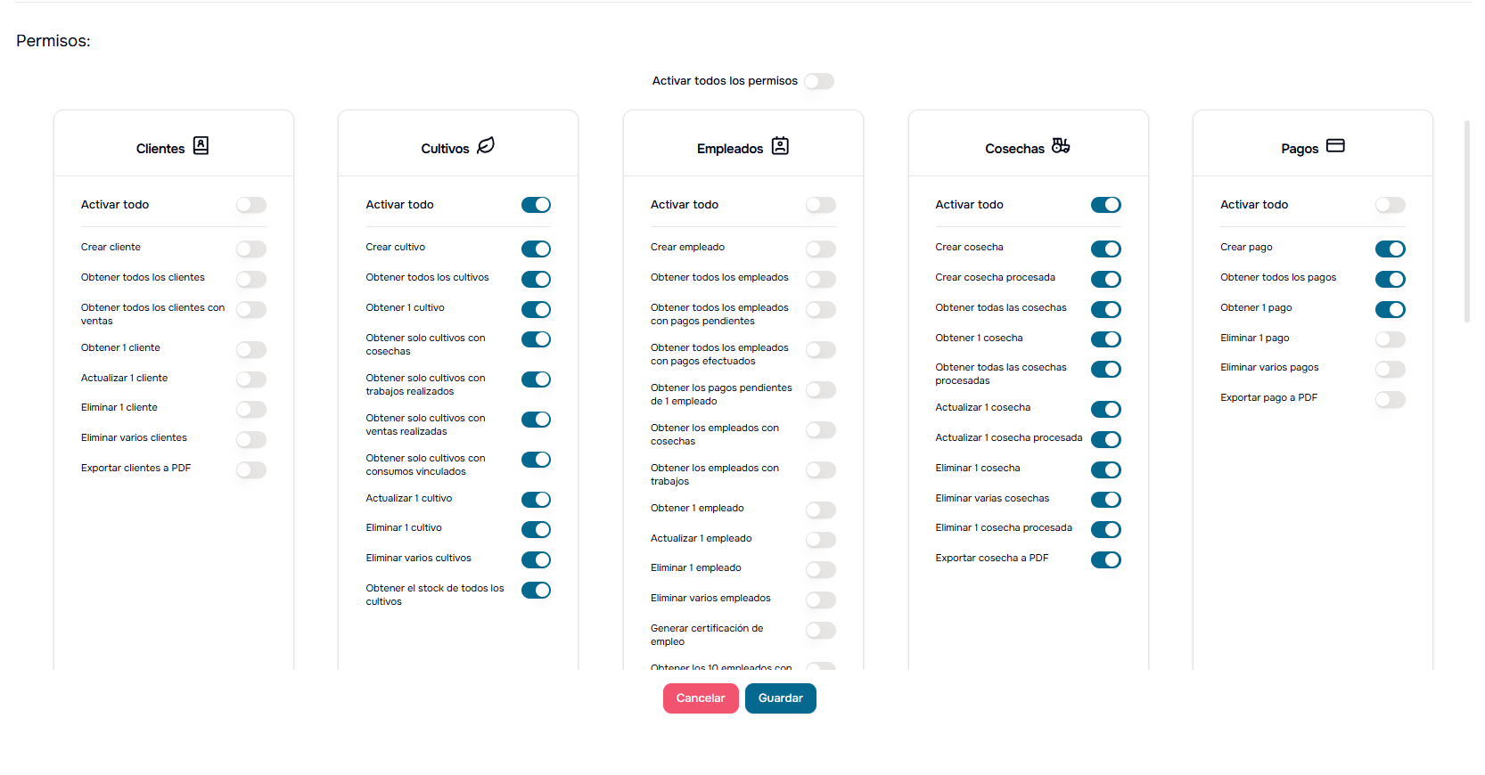 • Botón "Activar todos los permisos": Activa todos los permisos del sistema.